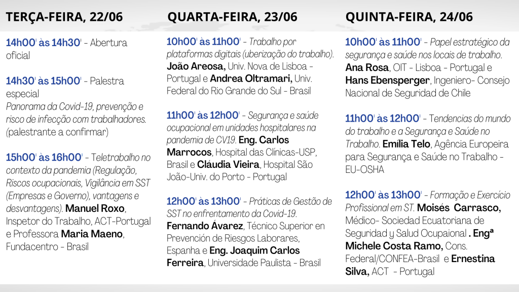 A programação a seguir encontra-se em fase de confirmação, devendo, em breve ser totalmente confirmada. Importante: Os horários informados referem-se a hora oficial de Brasília – Brasil. Em Portugal, os horários são: 22/06 – 18h00′ às 20h00′, 23 e 24/06: 14h00′ às 17h00′. Os participantes dos demais países devem verificar a hora certa das atividades nos seus respectivos fuso-horários.